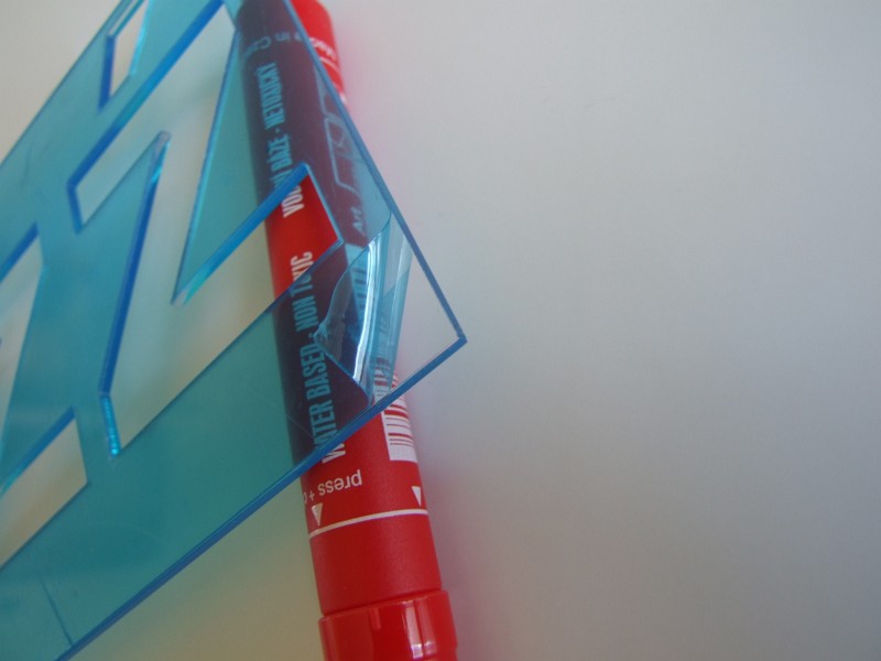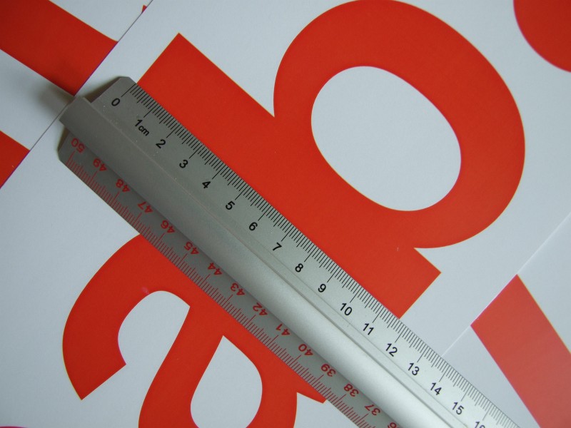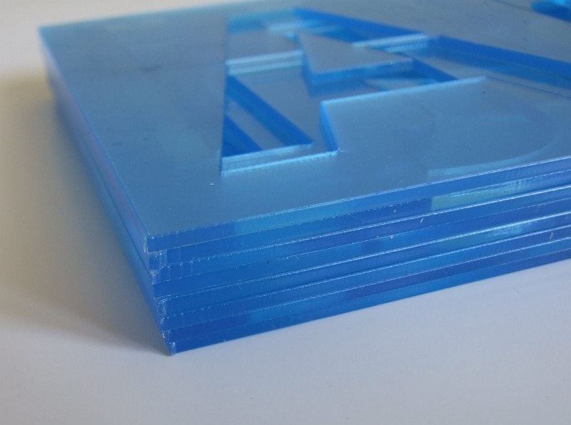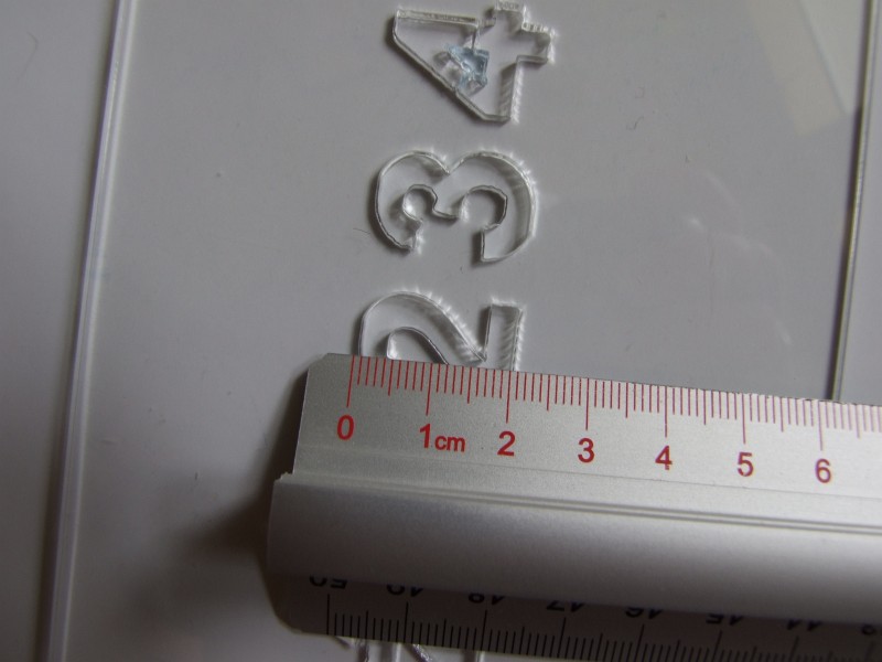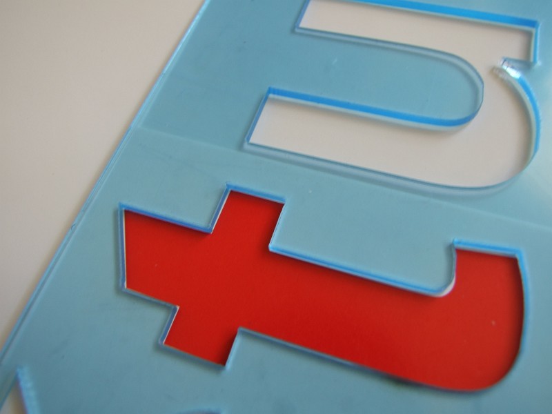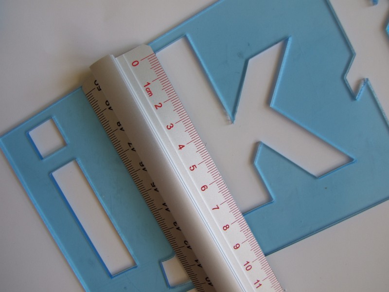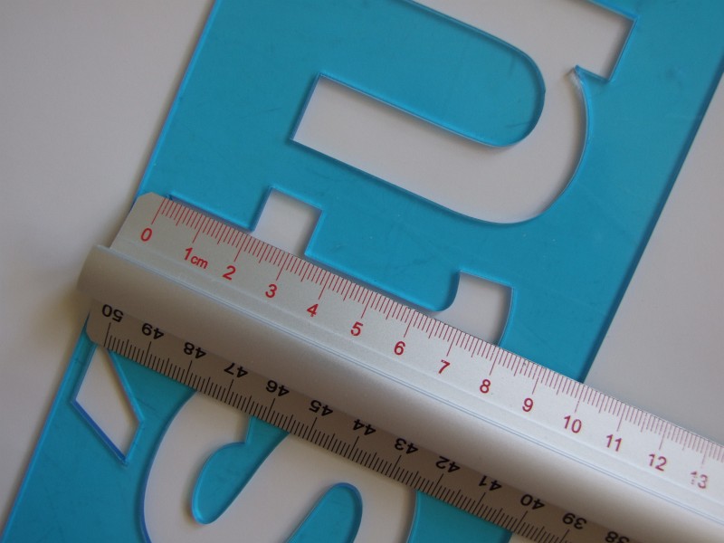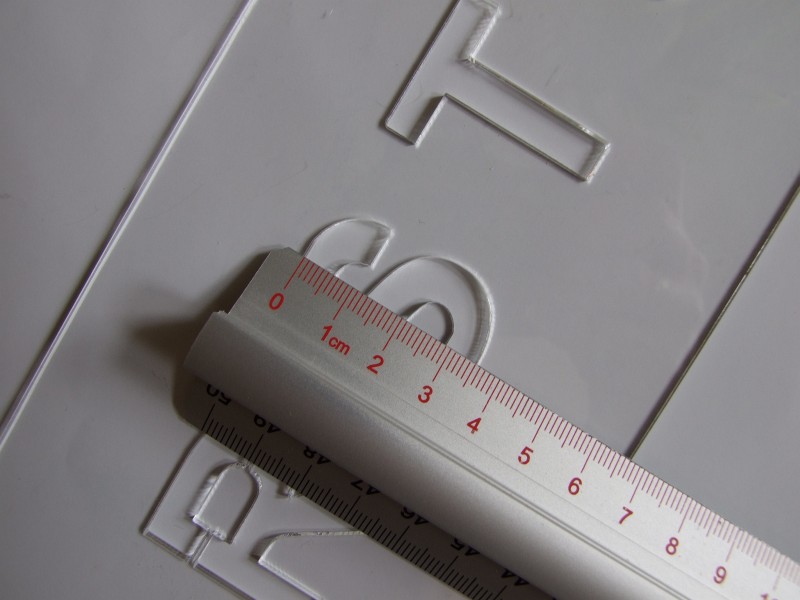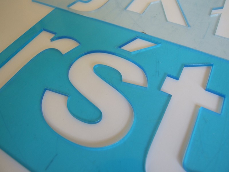 Szablony wykonane są z przeźroczystej pleksi o grubości 2 mm. Wybór materiału do wykonania szablonów nie jest przypadkowy: zdecydowaliśmy się na użycie przeźroczystej pleksi dla ułatwienia oceny odległości pomiędzy literami przy wykonywaniu kart.
