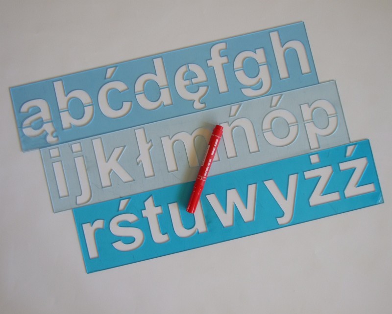 Na tabliczkach wycięte są szablony liter do odrysowania, małe litery – pełen alfabet uwzględniający znaki polskie, wysokość litery to 80 mm; Zestaw zawiera:
