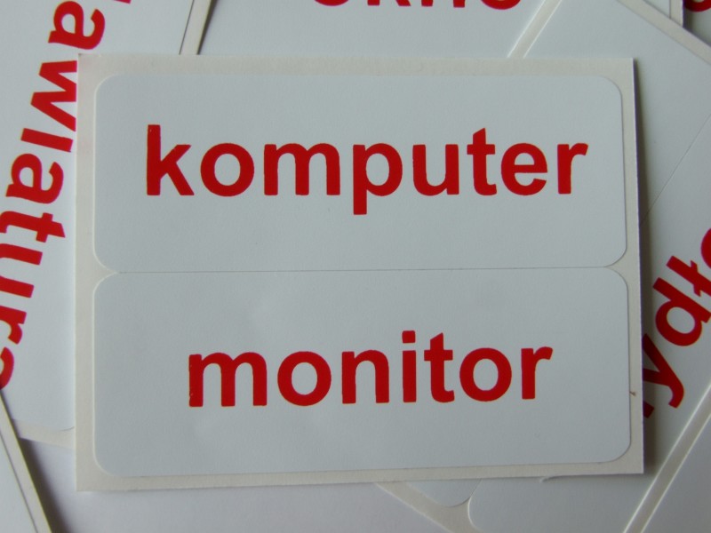 102 naklejki do oklejania przedmiotów, które otaczają naszych milusińskich, naklejki o wymiarach 95 mm na 35 mm to skuteczny sposób na naukę czytania i przy okazji kojarzenie słów z przedmiotem