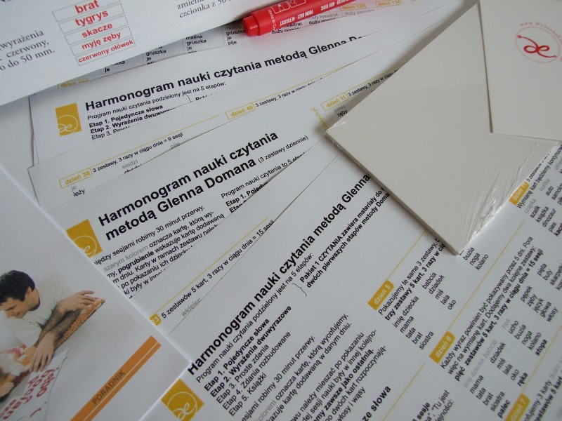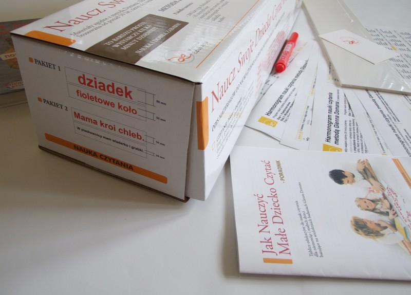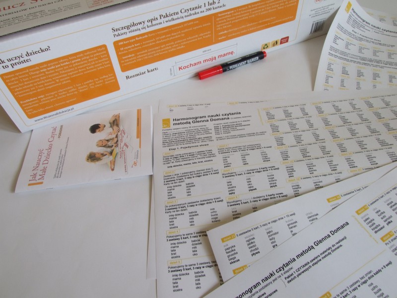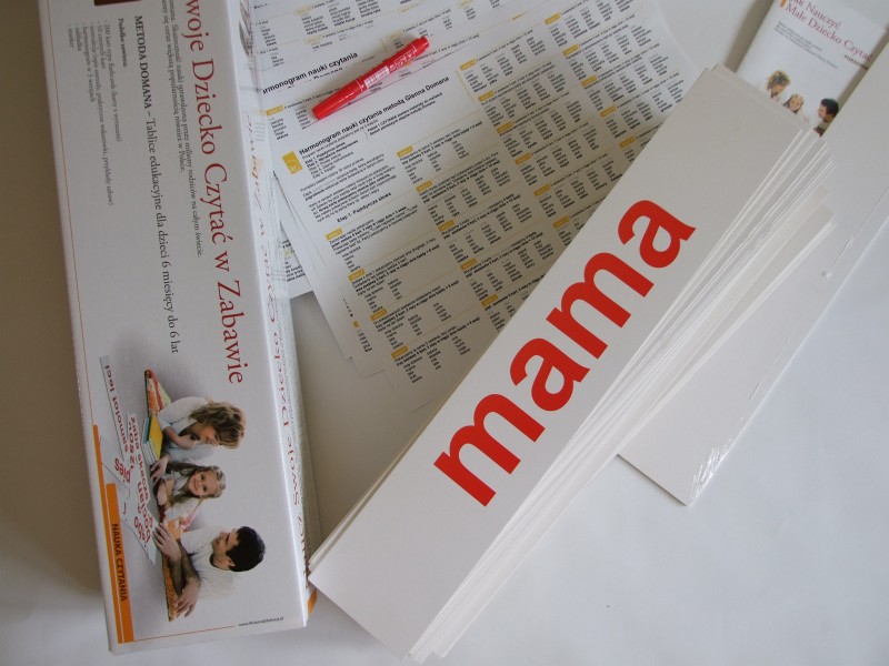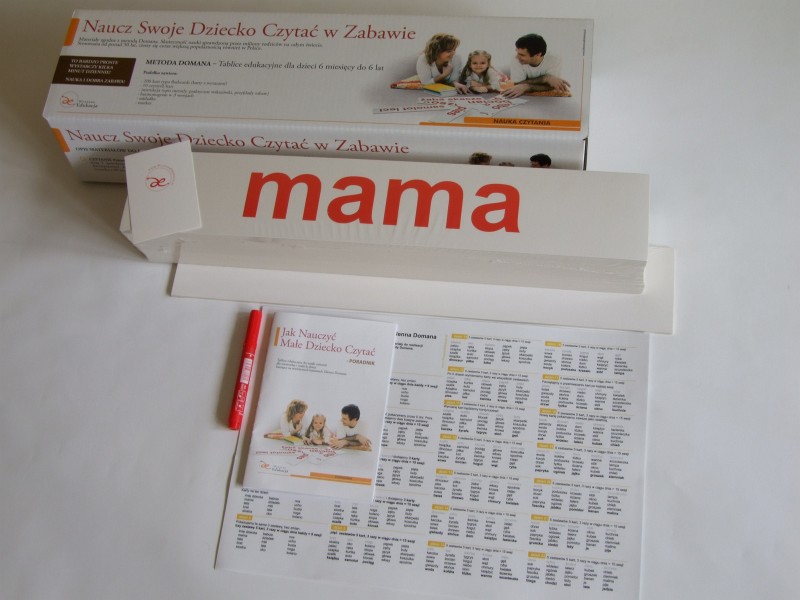 Naukę czytania Doman podzielił na 5 etapów, 1 – pojedyncze wyrazy, 2 – wyrażenia dwuwyrazowe, 3 – proste zdania, 4 – rozbudowane zdania, 5 – książeczki. Pakiet 1 zawiera karty Etapu I oraz II