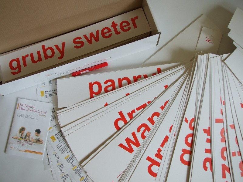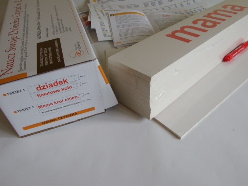 Nauka czytania Pakiet 1 zawiera pojedyncze słowa oraz wyrażenia dwuwyrazowe, nadruk czerwony, czcionka z 80 mm zmniejsza się do 50 mm. Poznane w tych etapach wyrazy będą utrwalane poprzez liczne powtórzenia w kolejnych etapach.