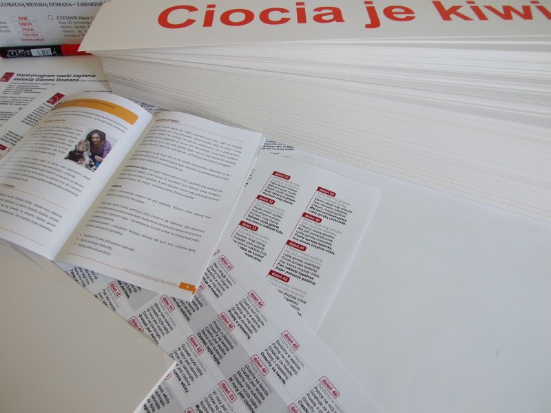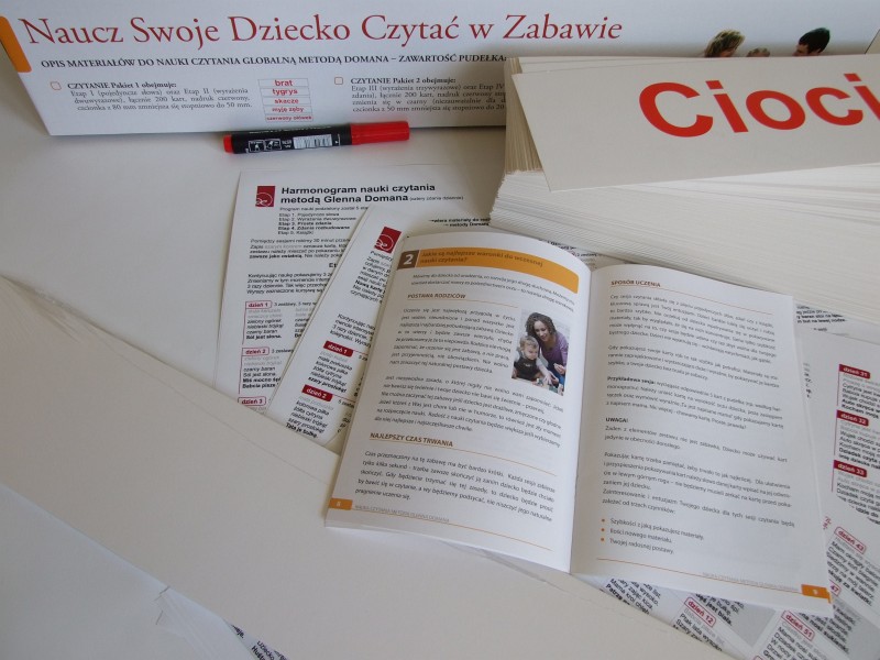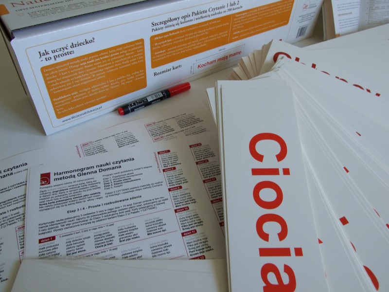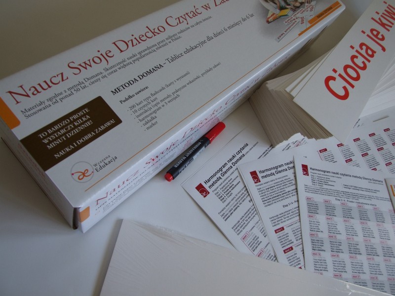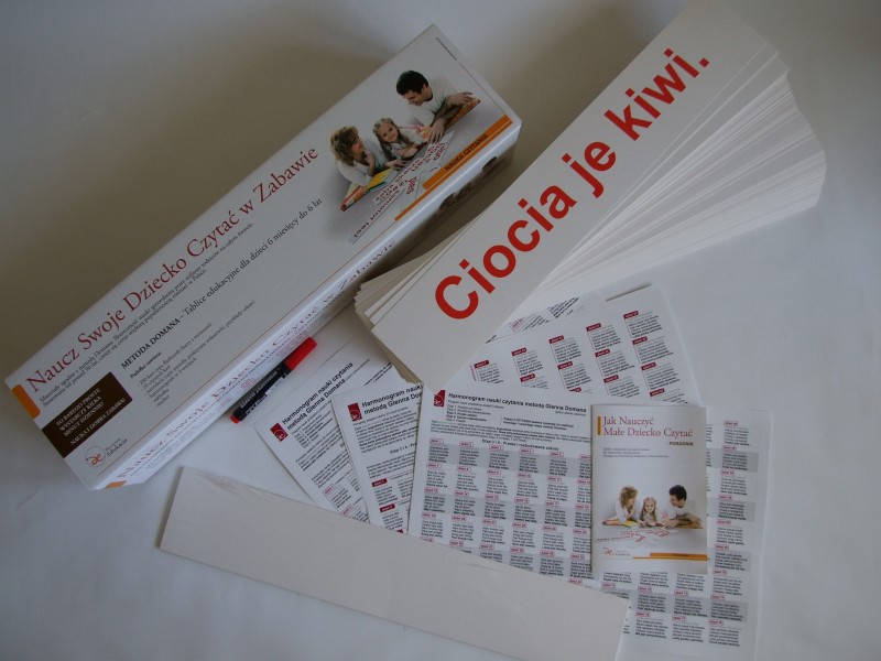 Naukę czytania Doman podzielił na 5 etapów, 1 – pojedyncze wyrazy, 2 – wyrażenia dwuwyrazowe, 3 – proste zdania, 4 – rozbudowane zdania, 5 – książeczki. Pakiet 1 zawiera karty Etapu III oraz IV