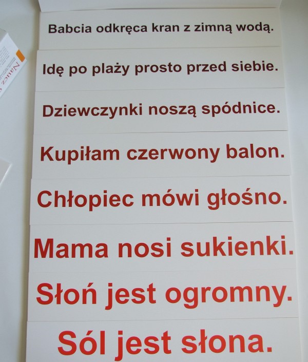 116 kart ze zdaniami przygotowującymi dziecko do czytania pierwszych książeczek. Dziecko w naturalny sposób uczy się przyimków (na stole, do domu, nad jezioro, itp.)