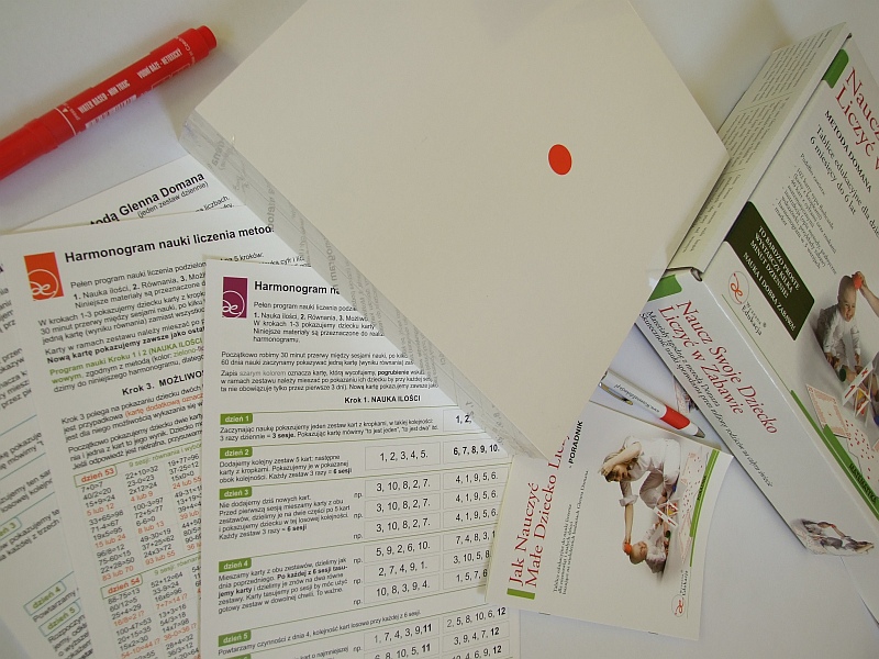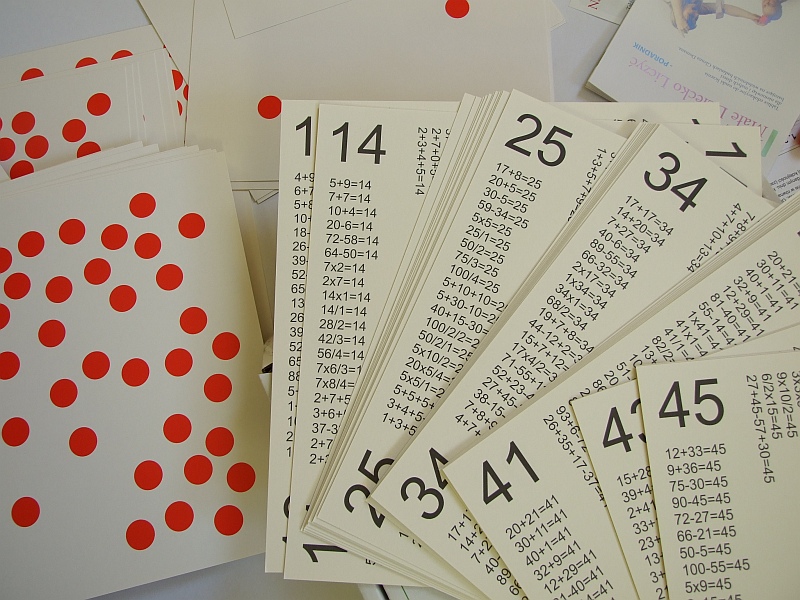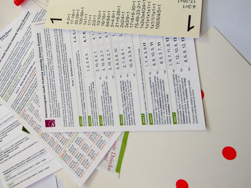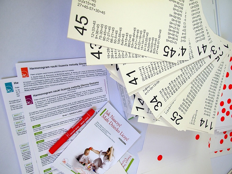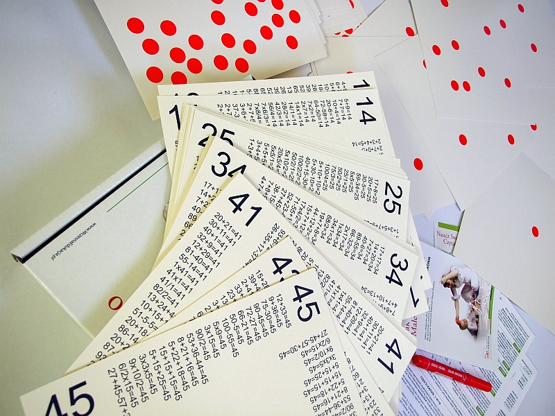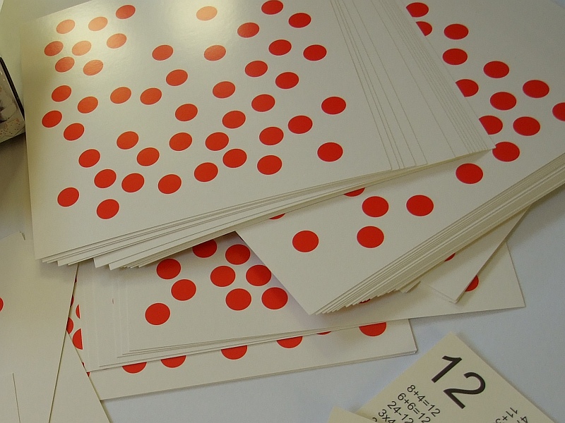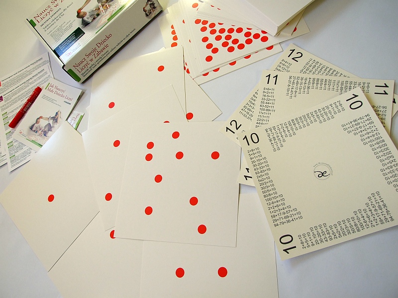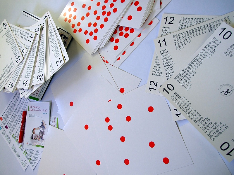Pakiet Matematyka 1 Kropki zawiera karty z nadrukowanymi kropkami o średnicy 19mm. Zestaw kart jest jednakowej wielkości i na każdej z kart niezależnie od ilości nadrukowanych kropek pozostawiono margines zgodny z zaleceniami do metody a na odwrocie kart nadrukowano liczbę odpowiadającą liczbie kropek danej karty. Rozmieszczenie kropek na kartach jest przypadkowe