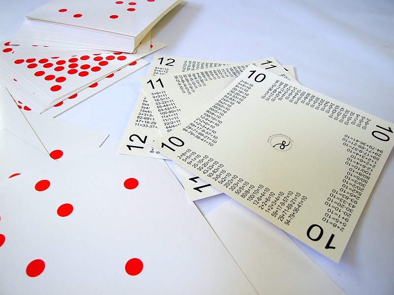 102 kart o wymiarach 280 x 280 mm od 1-100 karty z kropkami, karta 0 oraz czysta karta zapasowa, numeracja kart na odwrocie w każdym z rogów, stosowna do zaleceń nie sugerująca odpowiedniego ułożenia karty,